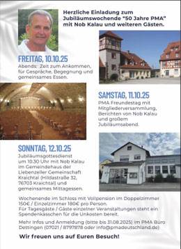 Einladung zur 50-jährigen Jubiläumsfeier von PMA Liebe PMA-Freunde, Wir möchten euch ganz herzlich zu unserer 50-jährigen Jubiläumsfeier von PMA einladen. Ein halbes Jahrhundert gelebter Mission, mutiger Entscheidungen und sichtbarer Treue Gottes. Austragungsort für dieses festliche Jubiläumswochenende ist das wunderschöne CVJM Schloss Unteröwisheim, Mühlweg 10, 76703 Kraichtal. Ein besonderes Highlight: Norbert Kalau wird anreisen, um uns mit hineinzunehmen in bewegende Geschichten vom Einsatzfeld und Einblicke in die vielfältigen Dienste und Entwicklungen der PMA geben. In Kürze erhaltet ihr auch die nächste Ausgabe des Insel-Echos, in der wir vorab schon mal über die 50-jährigen Jubiläumsfeierlichkeiten im Pazifik berichten. Auch die Anfänge werden nicht zu kurz kommen: Am Samstagmittag werden in einem vielseitigen Programm auch einige der Gründungsmitglieder von ihrem mutigen Start vor 50 Jahren erzählen – von Vision, Aufbruch und Gottvertrauen. Ein besonderes Highlight ist der Samstagabend: Wir rechnen mit vielen Gästen zu einem unterhaltsamen „Wetten, dass...? – PMA Special“. Den festlichen Jubiläumsgottesdienst feiern wir am Sonntag in der Liebenzeller Gemeinschaft Kraichtal, Hildastr. 32, 76703 Unteröwisheim. Alle wichtigen Informationen findet ihr in der beigefügten Einladungskarte. Wir würden uns sehr freuen, gemeinsam mit euch und der PMA-Familie unser 50-jähriges Jubiläum zu feiern. Es erwartet euch ein Wochenende voller Begegnung, Austausch, spannender Berichte und gemeinsamer Mahlzeiten. Bitte meldet euch zeitnah unter: info@pmadeutschland.de an.